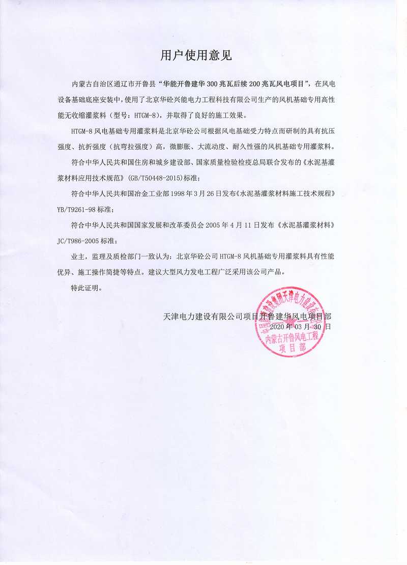用户好评=>华能开鲁建华二号300MW风电场后续250MW风电项目-天津电力建设有限公司风电灌浆料