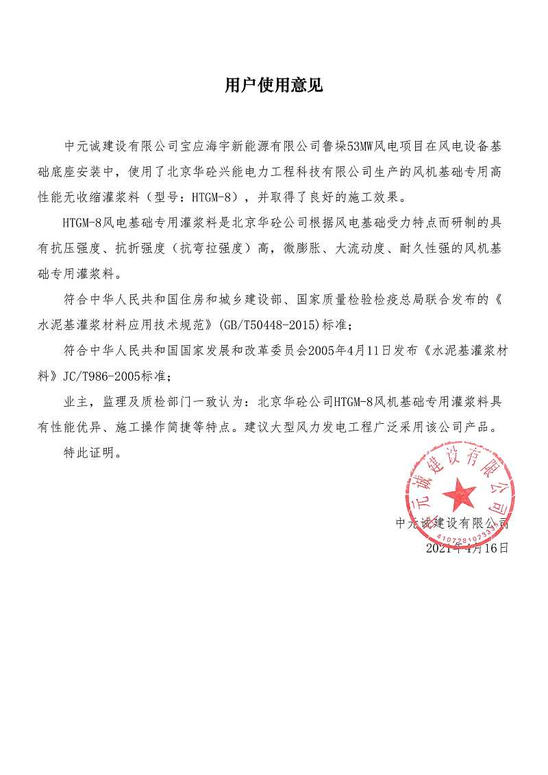 用户好评=>宝应海宇新能源有限公司鲁垛53MW风电项目-中元诚建设有限公司火电灌浆料