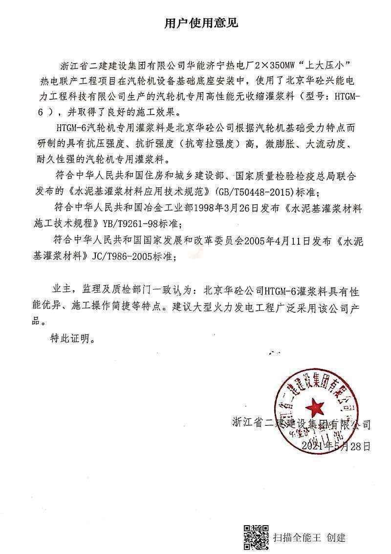 用户好评=>华能济宁热电厂2×350MW“上大压小”热电联产工程项目-浙江省二建建设集团有限公司火电灌浆料