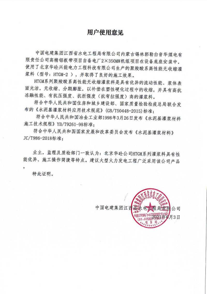 用户好评=>内蒙古锡林郭勒高精铝板带项目自备电厂2×350MW机组项目-江西水电工程局有限公司火电灌浆料