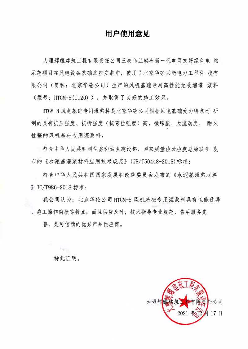 用户好评=>三峡乌兰察布新一代电网友好绿色电站示范项目-大理辉耀建筑工程有限责任公司风电灌浆料